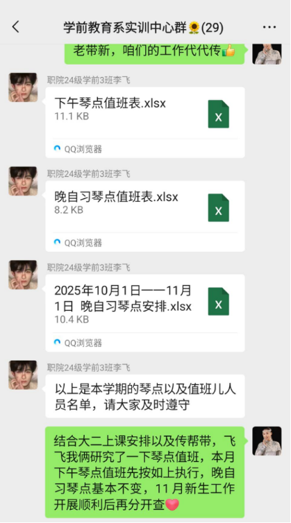 钢琴组组长李飞同学负责安排电钢琴实训室具体工作。他首先公布了自下周起实施的下午自由琴点与晚自习公共琴点值班表,明确了实训员的责任时段,保障电钢琴实训室的有序、高效开放。会后又组织大一新生实训员为各钢琴教室完成换水工作,以维护钢琴的时效,营造适宜的练习环境并现场教学演示了“查琴点”的标准流程,确保每位新成员都能清晰掌握检查要点。
