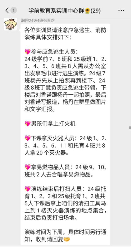 安全隐患排查专员张晋煜同学对安全教育培训和应急演练、灭火器培训做了明确的人员安排,要求各小组负责人细化流程,责任到人,确保全员覆盖、不漏一人。同时强调,所有参训人员务必准时到场,认真听讲,切实将“安全第一,预防为主”的理念落到实处,为构建平安校园筑牢坚实基础。